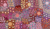 This work depicts Gabriella and Michelle’s Granmother’s Country at Laramba, a story passed through their maternal line. U-shapes mark women, concentric circles show gathering places and dots and tracks map bush foods and ancestral paths. Taught by their father, Clifford Possum Tjapaltjarri, they continue to honour and preserve this Country and its stories.