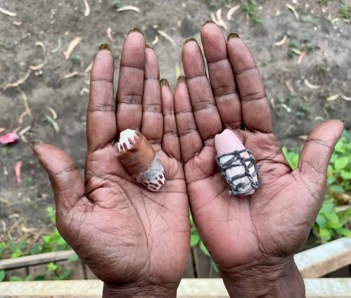 Noeleen Danjibana Lalara holding shells from the Dadikwakwa-kwa. © Anindilyakwa Arts, Anindilyakwa Land Council, 2023.