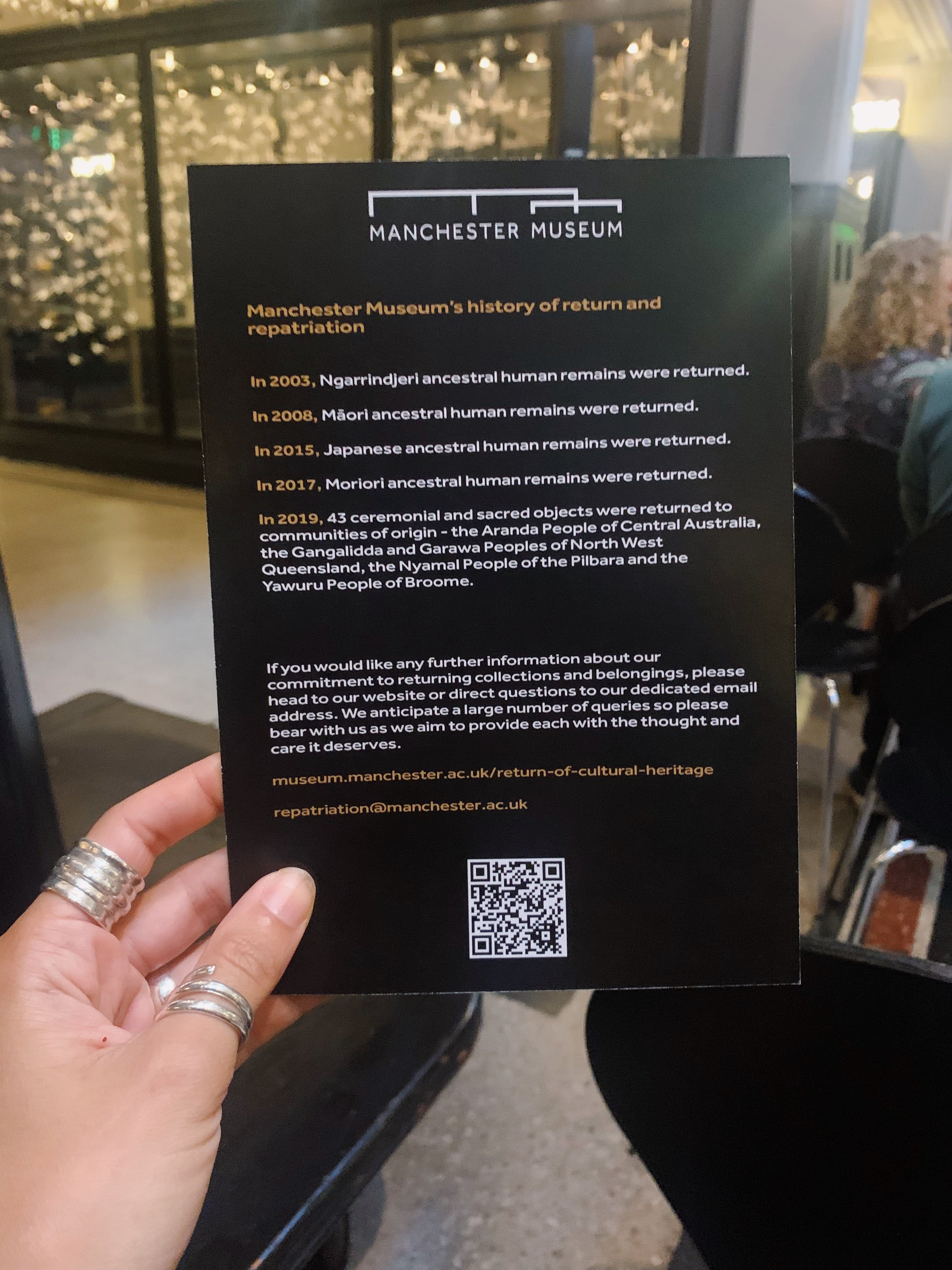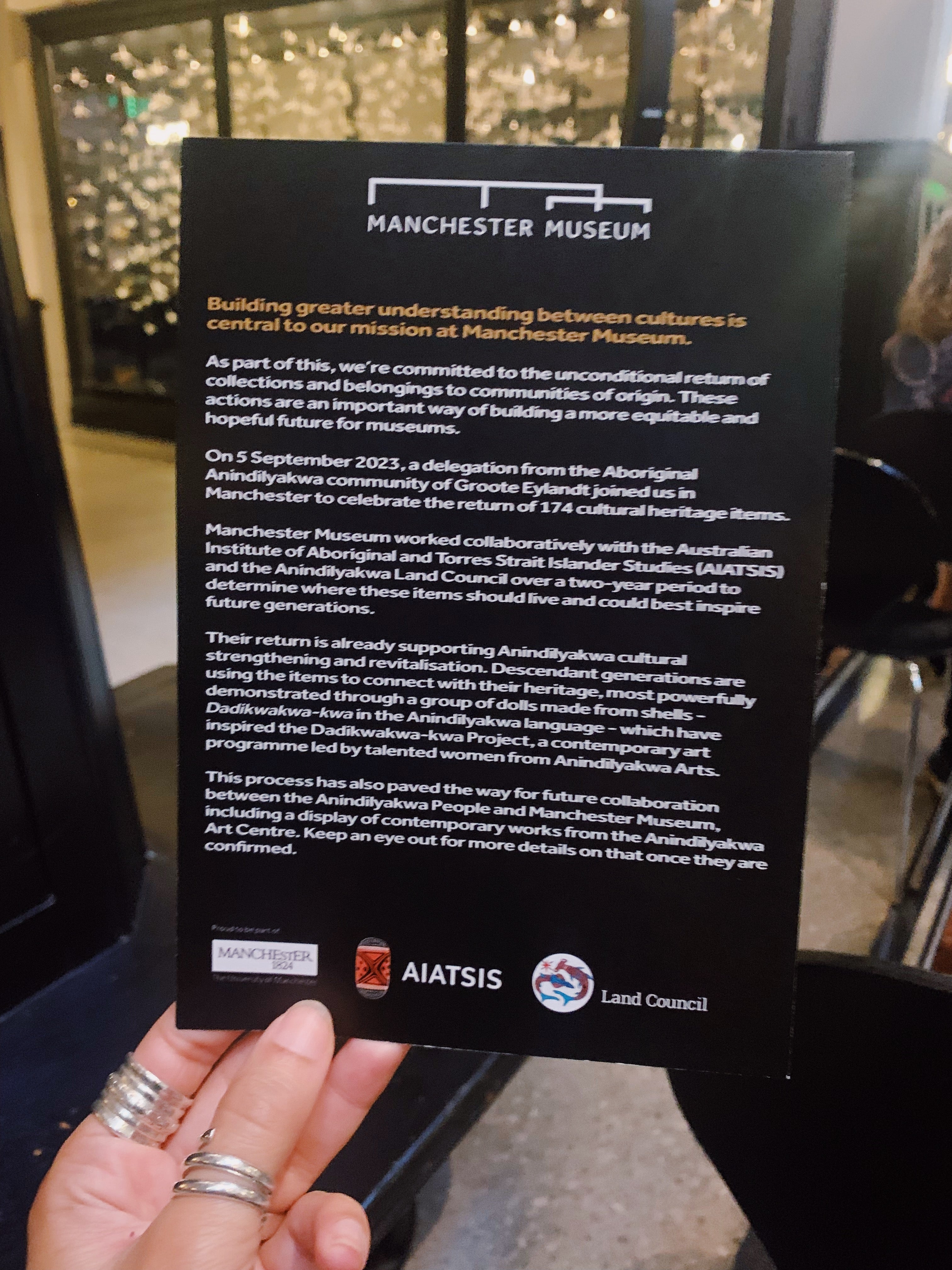 Coe Gallery was honoured to attend Manchester Museum for their return of 174 cultural heritage items to the Anindilyakwa People of Groote Eylandt, following a three-year, community-led process grounded in cultural protocols and respect. The formal handover took place on 5 September 2023 at the museum, after close collaboration with the Anindilyakwa Land Council and AIATSIS, including museum staff travelling to Groote Eylandt at the community’s invitation. The museum emphasised an unconditional approach aligned with the UN Declaration on the Rights of Indigenous Peoples, recognising that returning belongings supports cultural strengthening and revitalisation, seen in the revived practices around Dadikwakwa-kwa (shell dolls) and ongoing partnerships, including a planned display of contemporary Anindilyakwa works. This return builds on Manchester Museum’s wider history of repatriation, such as the 2019 handover of 43 sacred and ceremonial items to Aranda, Gangalidda and Garawa, Nyamal, and Yawuru communities.